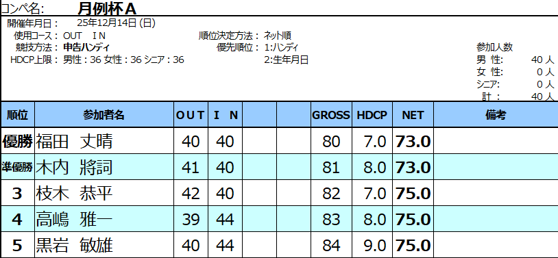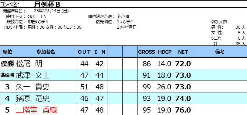 月例杯12月成績表 2025.12.14 インフォメーション いつもご参加いただき誠にありがとうございます。 2025年12月14日(日) 月例杯が開催されました。成績A・Bの上位5位まで発表いたします。